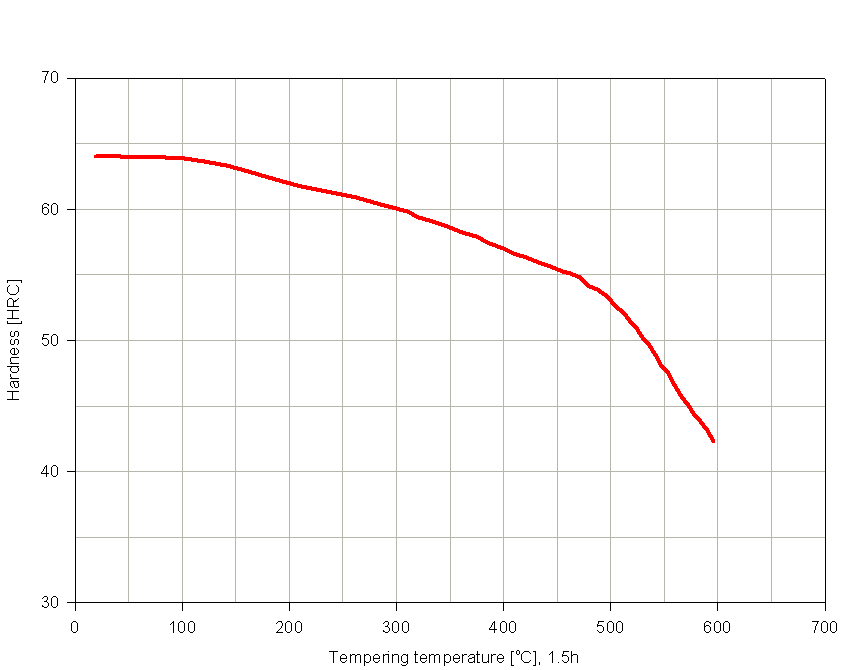 For small parts up to thickness 30 mm. Harden from a temperature of 960-100°C followed by air, comompressed air quenching. Hardness after quenching is 63-65 HRC.