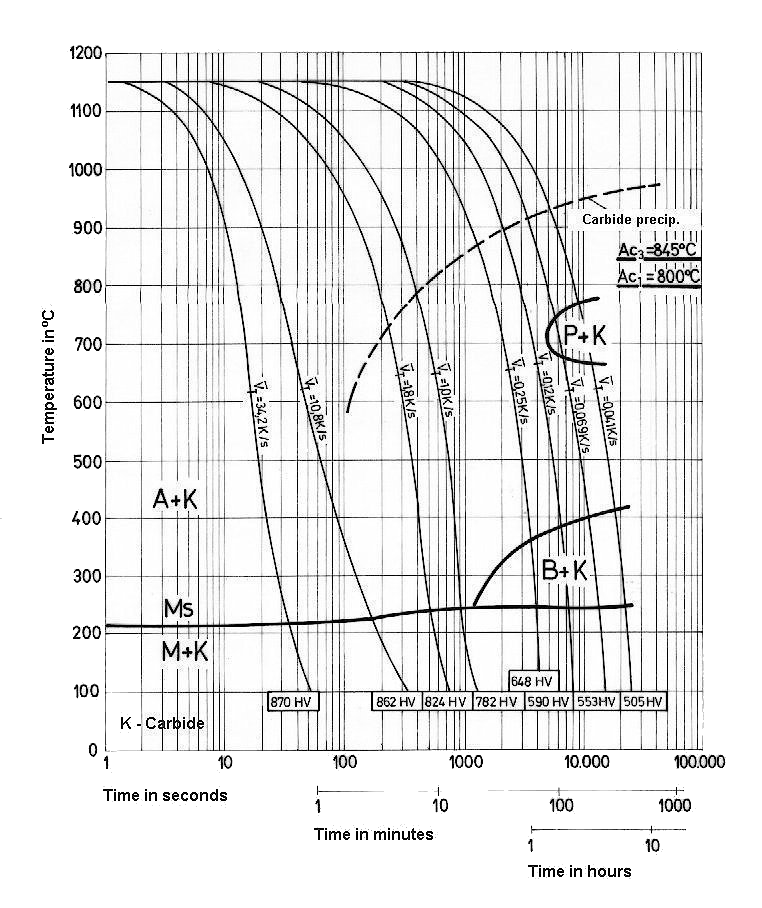 Annealing: Annealed at 850°C. Soak thoroughly at this temperature and furnace cool. Hardening: Pre heat slowly to 840°C/860°C and thoroughly soak. Continue heating to the final hardening temperature of 1230/1250°C and allow the 1.3343 component to be heated through. Quench in oil or cool in air. Great care must be take not to allow the 1.3343 tools to remain too long at the hardening temperature.
