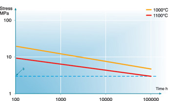 Comparing 353 MA with cast alloys, it can be seen that the creep strength is not as high. The additional strength in cast material is, however, normally not utilized, since the limiting factor for tube life is carburization and time between decoking.