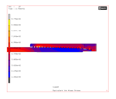 casing. From the numerical value of stress and contact pressure obtained from these simulation makeup work status, interference quantity of joint thread and seal face of premium thread connection can be valuated. Through changing geometry parameter and structure of seal face of thread connection, the designed thread connection can achieve the requirement of makeup integrity. After casing makeup’s accomplishment and running, the casting bears multi-loads including: inside pressure, outside pressure, axial load, heat stress etc. Therefore structure integrity and sealing integrity of premium thread connection are needed under complex loads. Figure 5, 6 and 7 indicate finite element simulation calculation value of inside pressure status Von Mises equivalent stress and seal contact pressure distribution after the makeup of premium thread connection casing. From these simulation results, changes of connection stress and contact pressure of sealing face, after the connection bears high inside pressure, can be observed distinctly. Other load condition and complex load condition may also be simulated. In this way, at the beginning of development, the performance of products can be understood roundly.