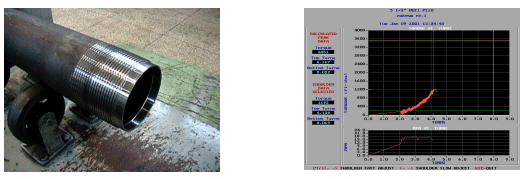 After completing simulation and parameter design of product structure and processing products, which satisfy the design requirement, by numerical control machine tool, full-scale performance testing should be applied. The experiments include makeup performance, thread off performance and sealing performance. Experiment equipment is makeup and breakout experiment machine of USA H.O.MOHR Engineering Design Research Company, tension experiment machine of Japan SHIMADZU company and high gas pressure pump of USA, respectively.
