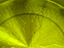 Convection cells are visible in the heated cooking oil in the pot at left. Heating the oil produces changes in the index of refraction of the oil, making the cell boundaries visible. Circulation patterns form, and presumably the wall-like structures visible are the boundaries between the circulation patterns.