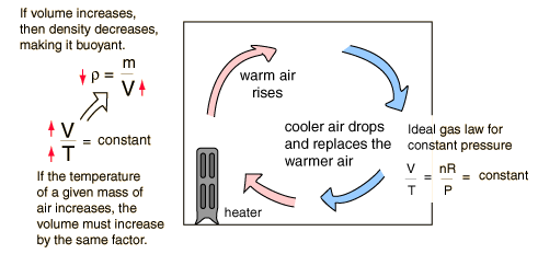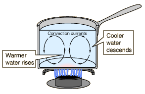 Convection can also lead to circulation in a liquid, as in the heating of a pot of water over a flame. Heated water expands and becomes more buoyant. Cooler, more dense water near the surface descends and patterns of circulation can be formed, though they will not be as regular as suggested in the drawing.