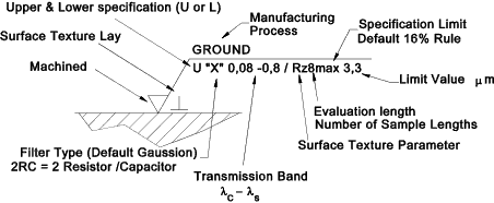 Machined finish, unilateral upper specification limit, transmission band 0,008-0,8mm