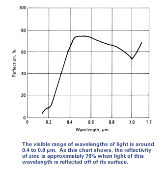 A newly-galvanized part with the normal pure zinc layer on the outside has a natural reflectivity of over 70% in the visible range. If the outer surface of the part has an intermetallic layer, rather than the normal pure zinc layer, the reflectivity is greatly reduced. This reflectivity change will also happen over time as the galvanized part weathers and the zinc oxides and carbonate films form on the surface of the part. However, if the surface must be dulled immediately, there have been some treatments used in the past that have proven successful. If surface reflectivity is an issue, contact your local galvanizer to discuss possible options to producing the desired coating appearance.