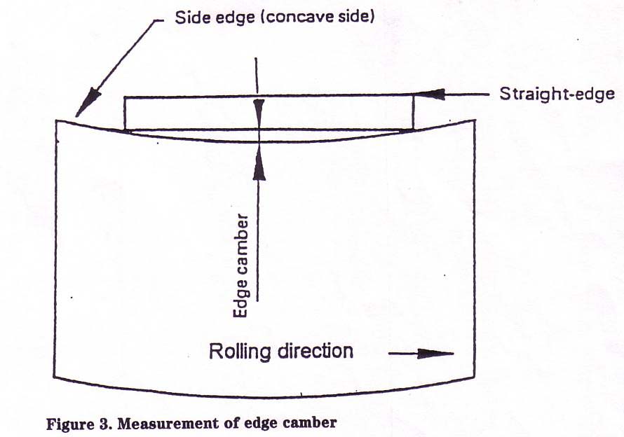 Edge camber is the greatest deviation of a side edge from a straight line, the measurement being taken on the concave side with a straight edge as shown in the diagram below: