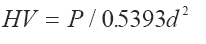 with F being the applied load (measured in kilograms-force) and D2 the area of the indentation (measured in square millimetres). The applied load is usually specified when HV is cited.